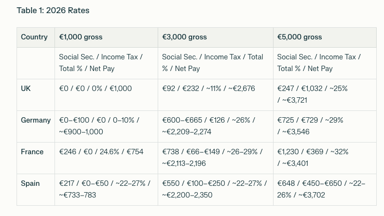 Reviewing the 2026 and 2028 rates tables reveals clear disparities in the tax and social security burden borne by freelancers across countries and income bands*.