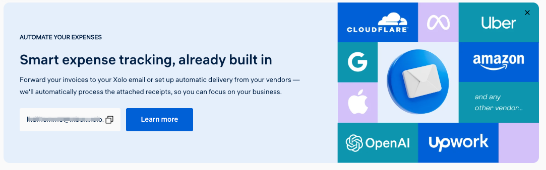 Xolo gives you a dedicated email address for expenses. Receive a bill? Forward it to your Xolo maildrop. Regular bill you don’t need to oversee? Set the maildrop address right in the service provider’s portal. It then magically appears in your expense queue, ready to be categorised and matched with outgoings. No downloading, no organising folders, no "I'll send those receipts to my gestor this weekend" and then forgetting until the end of the quarter is breathing down both your neck and theirs.