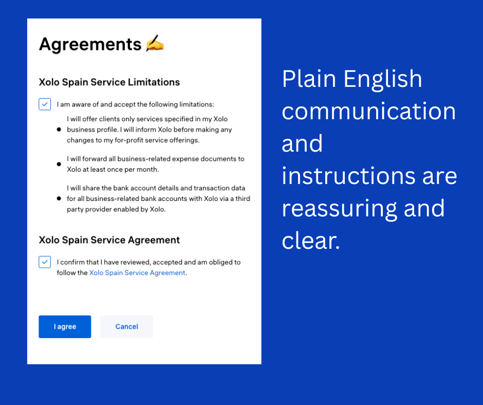 Xolo Spain is designed for professional service freelancers — consultants, developers, designers, translators, marketers, teachers, and similar. If you sell physical products, need a commercial licence, or trade in cryptocurrency, it's not the right fit. They're clear about this before you sign up, which I appreciate — better to know upfront than discover three months in that your situation isn't supported.